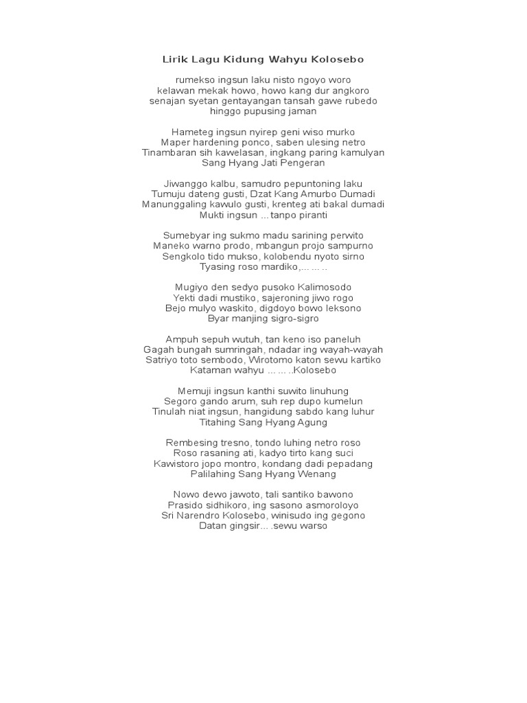 Hameteg ingsun nyirep geni wiso murko. Maper hardening ponco, saben ulesing netro. Lia sholawat kidung wahyu kolosebo. Blog tempat berbagi sholawat mulai dari lirik sholawat, download mp3 dan juga video sholawat yang dilengkapi dengan teks lirik. Lirik kidung wahyu kolosebo andrian pratama. Tips pencarian lirik favorit anda. Kidung wahyu kolosebo kanjeng sunan kalijogo kurang lebih artinya dalam bahasa indonesia seperti berikut karena bahasa jawa lebih tua. Anda mengetahui judul dan nama penyanyi. Telah diceritakan di berbagai media bahwa kidung wahyu kolosebo adalah untaian tulisan. Auto scroll light mode dark mode