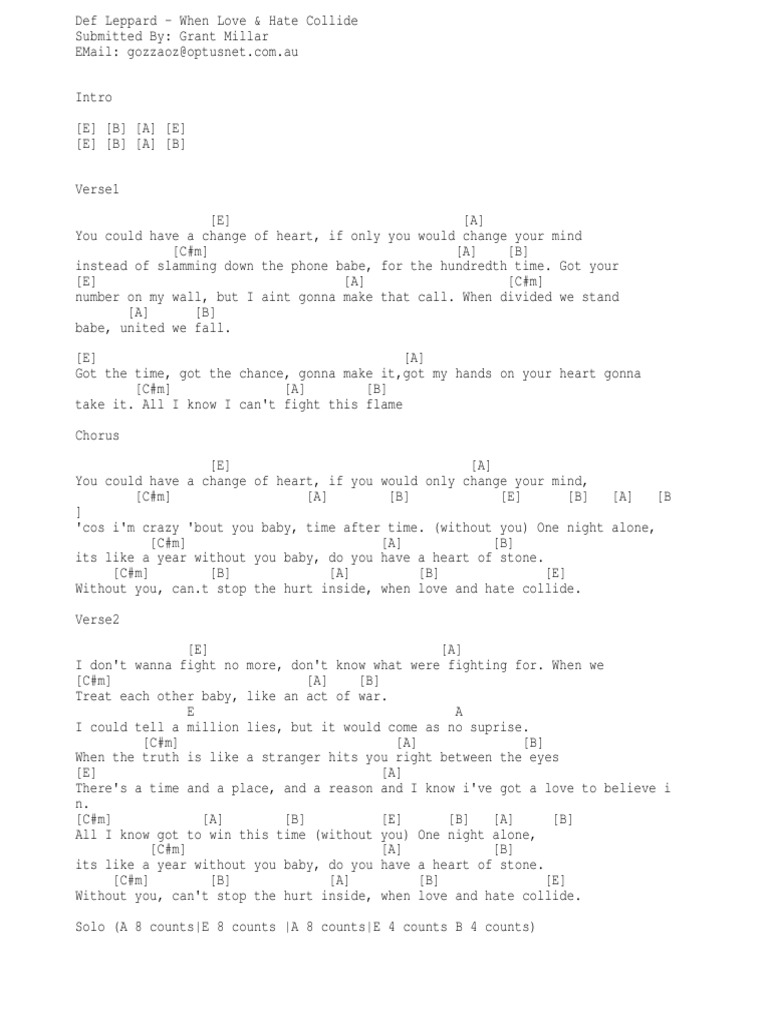 [verse 1] you could have a change of heart, if you would only change your mind. Berikut ini lirik dan chord lagu when love and hate collide dari def leppard. You could have a change of heart, if you would only change your mind. When love and hate collide. [verse 2] e c#m a i don't wanna fight no more, i don't know what we're fighting for. And i know i got a love to believe in all i know got to win this time without you one night alone is like a year without you baby do you have a heart of stone without you can't stop the hurt inside when love and hate collide you could have a change of heart if you would only change your mind cause i'm crazy 'bout you baby crazy, crazy without. When we treat e b e each other baby, like an act of war. I could tell a million lies, but it c#m a would come as no surprise. You could have a change of heart if you would only change your mind instead of slammin' down the phone girl for the hun…