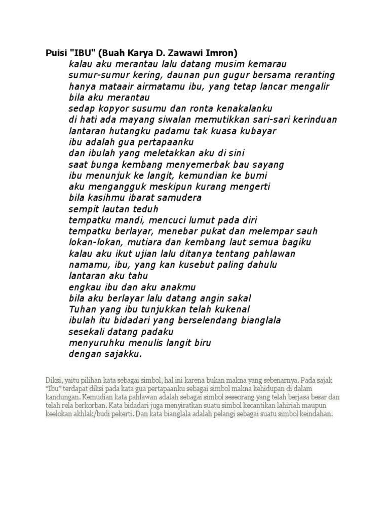 Sadap kopyor susumu dan ronta kenakalanku. Rahman, bahkan menegaskan bahwa cinta zawawi terhadap madura adalah cinta yang aktif, hal yang berbeda dengan cinta pada sosok ibu yang bersifat pasif. Pada mulanya hanya sebagai kegemaran dan panggilan jiwa saja. Menulis puisi sejak usia 13 tahun, ketika ia di pesantren. Dia membayangkan bagaimana hidup jauh dari ibu tercintanya. Read or download puisi ibu d for free zawawi imron at digivaley.com Puisi ibu karya d zawawi imron.puisi ibu menyenyuh hati.pertemuan penyair nusantarappn xi kudus 2019d zawawi imronibukalau. Liputan6.com, sumenep sejak puisi pertamanya berhasil menembus redaksi harian bhirawa pada 1976, penyair d. Surakarta, unhas makasar, ikip malang dan balai sidang senayan jakarta.